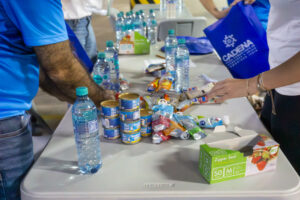 Cada kit incluyó una barra de proteína, atún, galletas, agua, suero, colado, cuchara y una bolsa reutilizable, con el propósito de brindar un apoyo básico a niñas y niños en contextos migratorios.